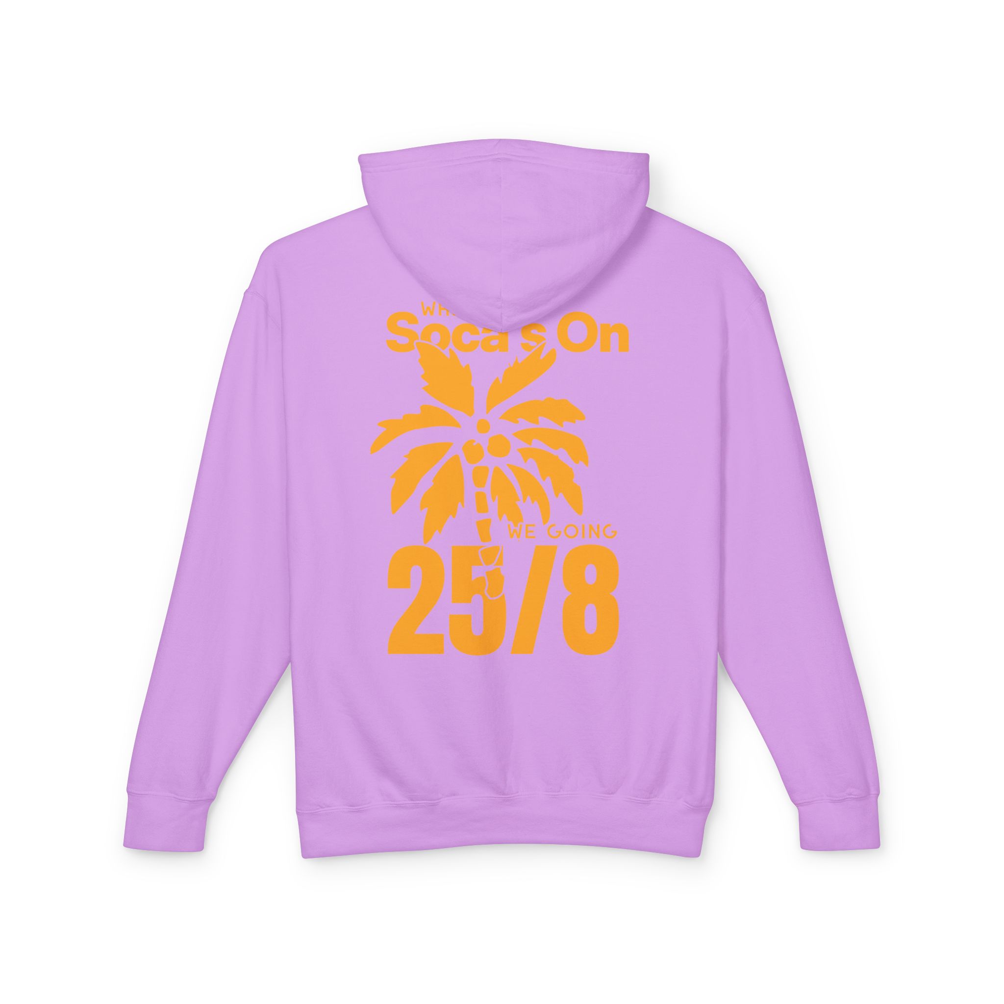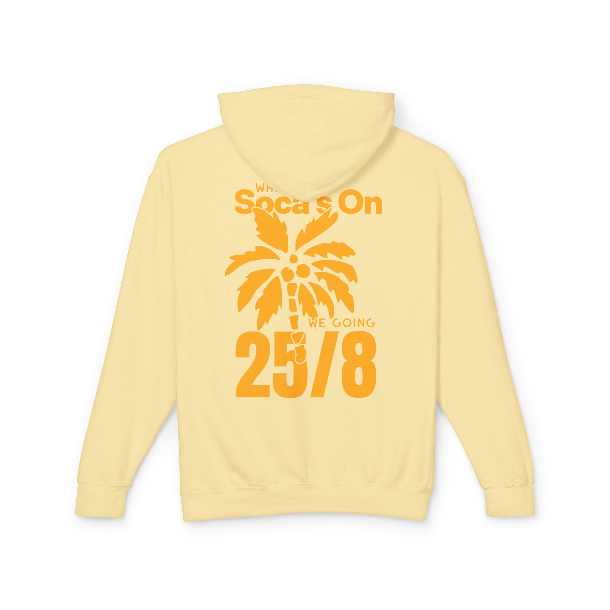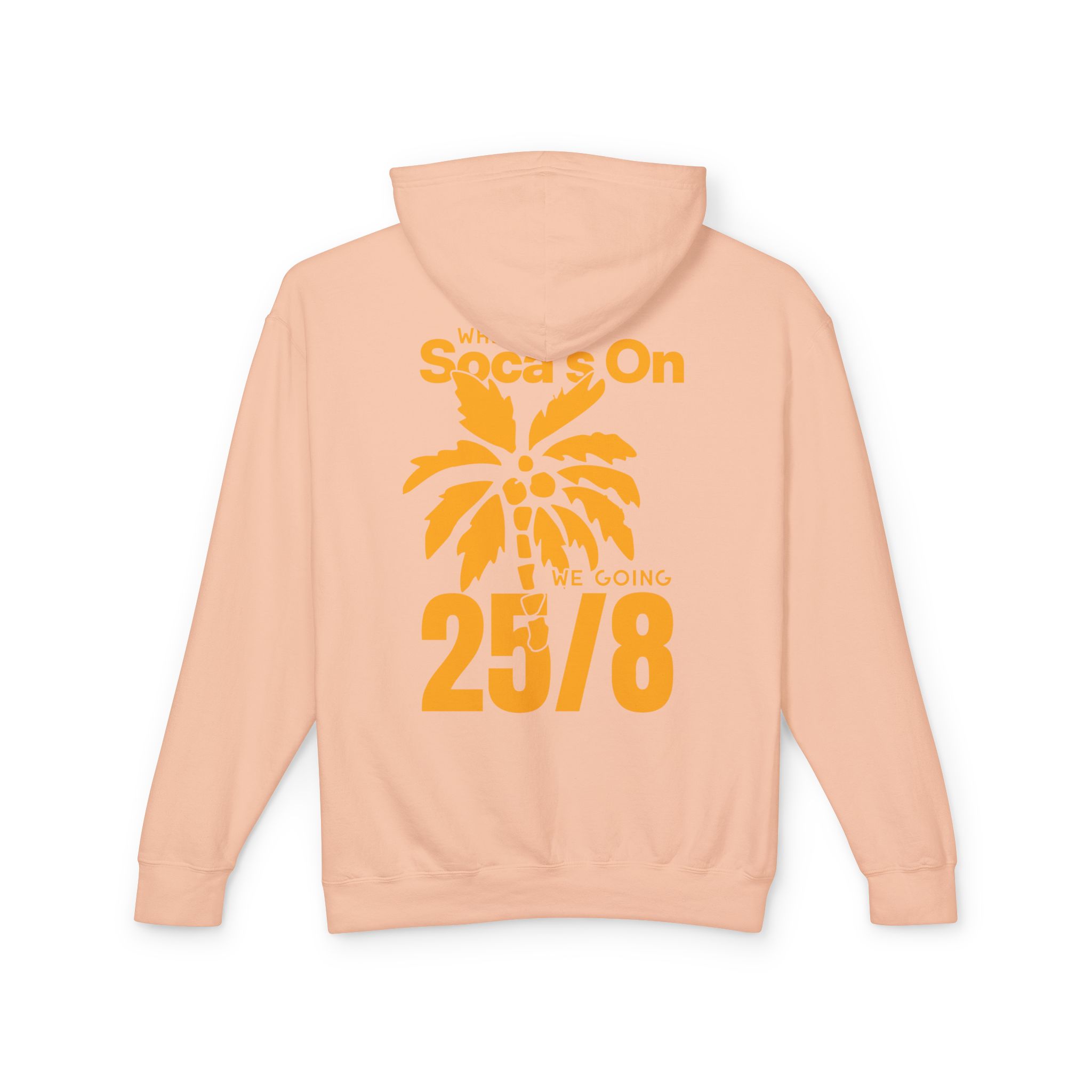 Lightweight and breezy, this cotton hoodie brings the heat without the weight. Bright, sun-soaked graphics — a bold “25/8” on the chest and a palm-and-type design across the back — evoke street parties and island sunsets. The relaxed cut and jersey-lined hood make it an easy layer for late-night gatherings or daytime rhythms. Wear it on the move: it sits comfortably over tees, moves with you, and keeps the mood bright when the temperature dips. Thoughtful details like a soft twill label and OEKO-TEX low-impact dyes mean it looks good and feels considerate to the planet.