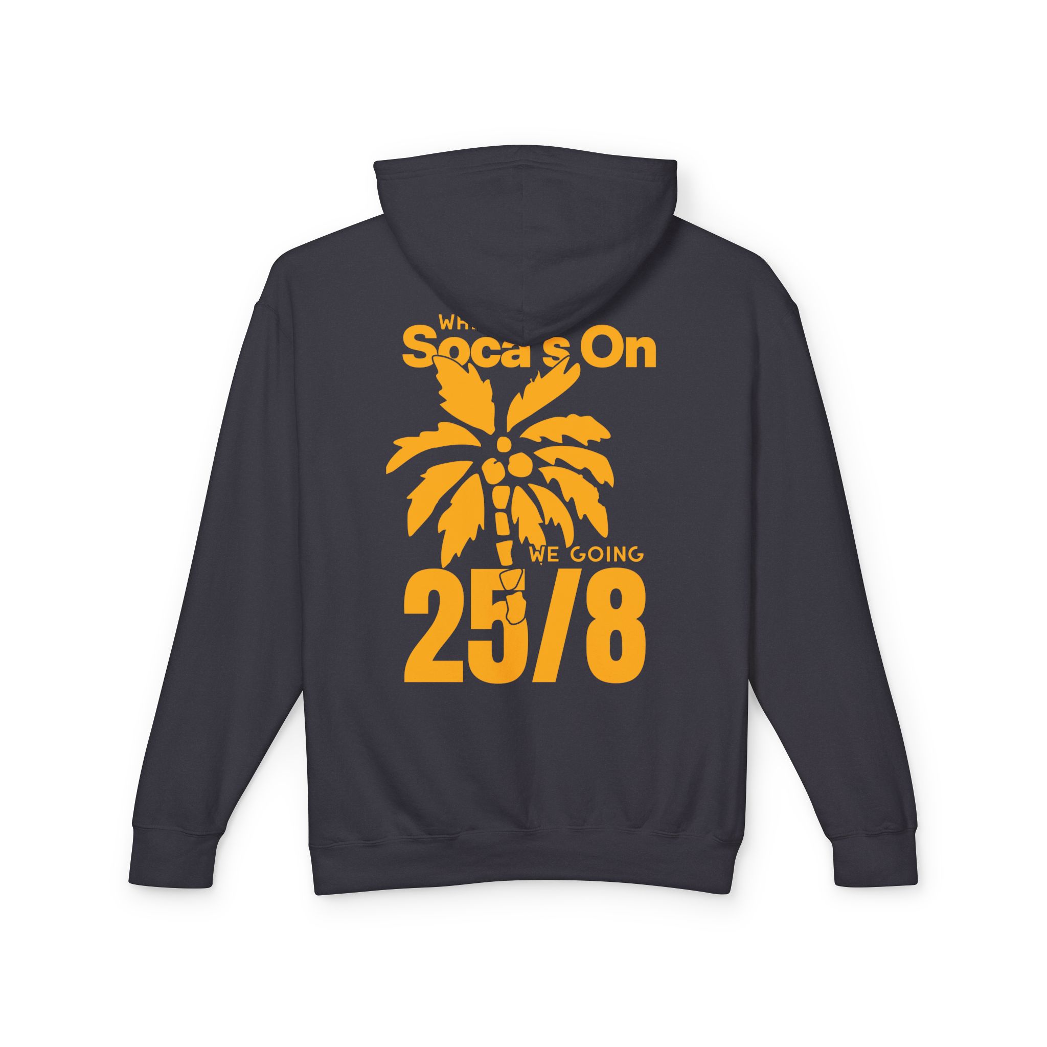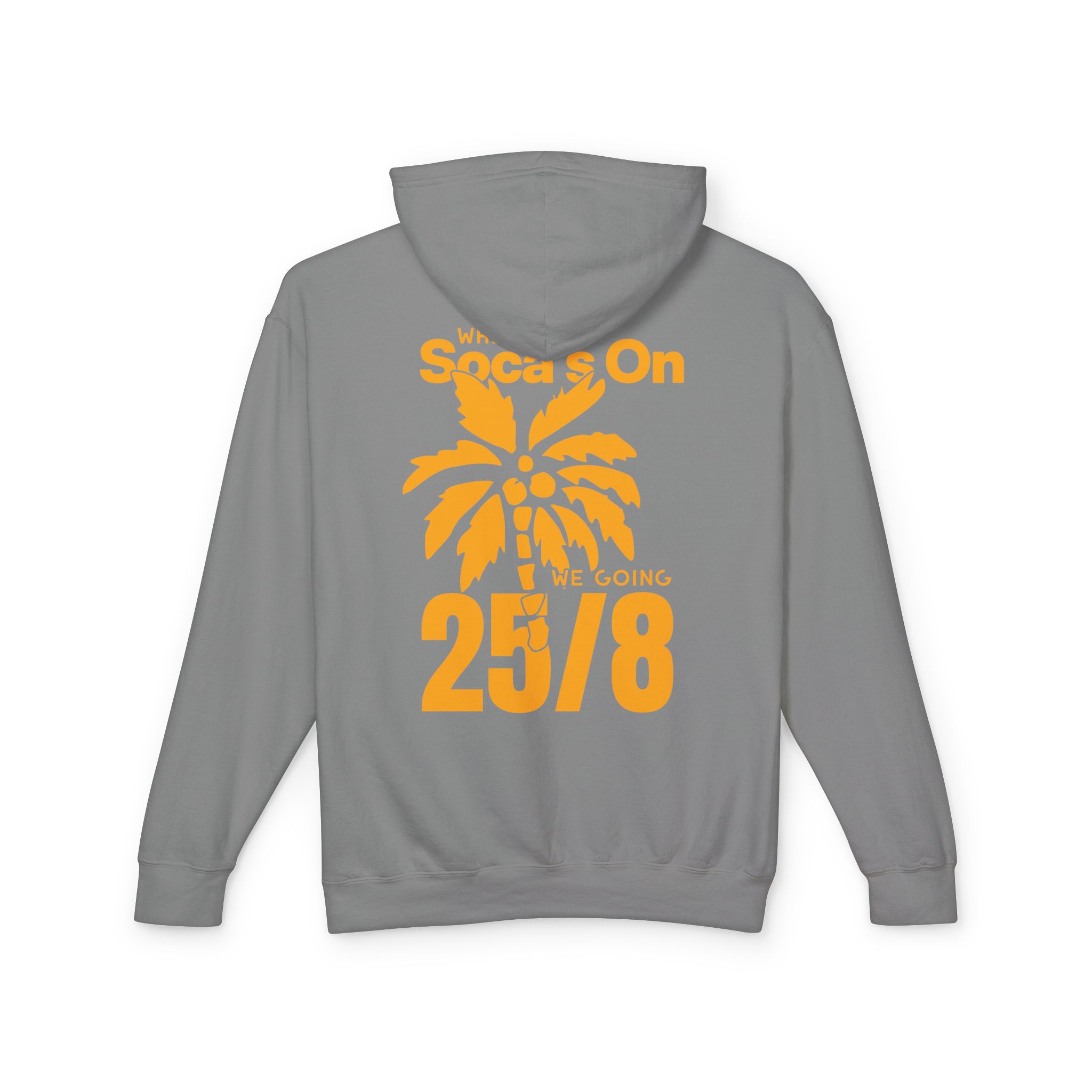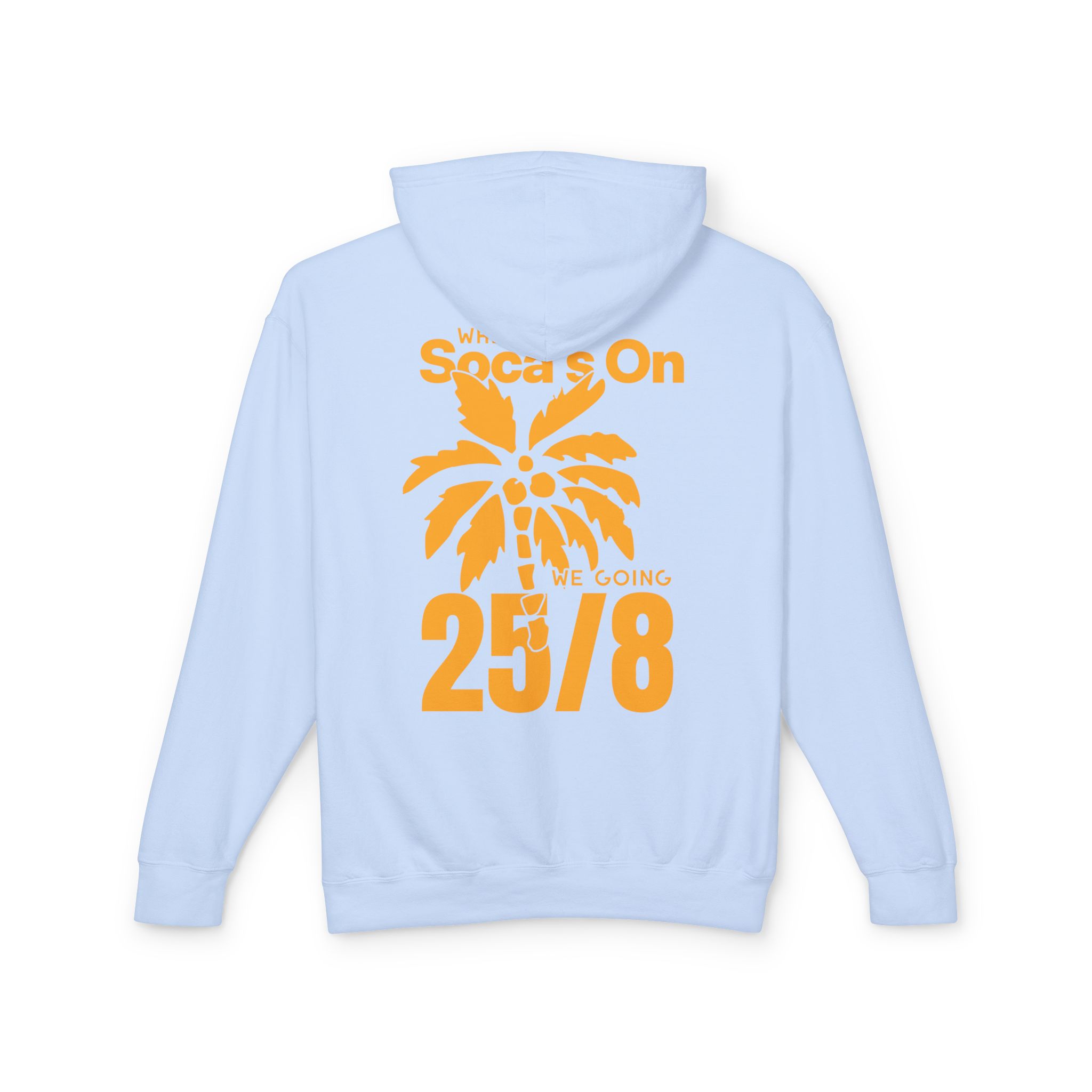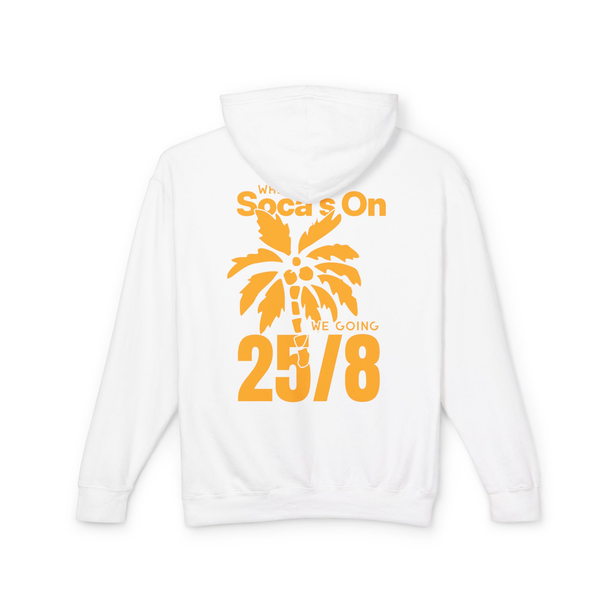 Lightweight and breezy, this cotton hoodie brings the heat without the weight. Bright, sun-soaked graphics — a bold “25/8” on the chest and a palm-and-type design across the back — evoke street parties and island sunsets. The relaxed cut and jersey-lined hood make it an easy layer for late-night gatherings or daytime rhythms. Wear it on the move: it sits comfortably over tees, moves with you, and keeps the mood bright when the temperature dips. Thoughtful details like a soft twill label and OEKO-TEX low-impact dyes mean it looks good and feels considerate to the planet.