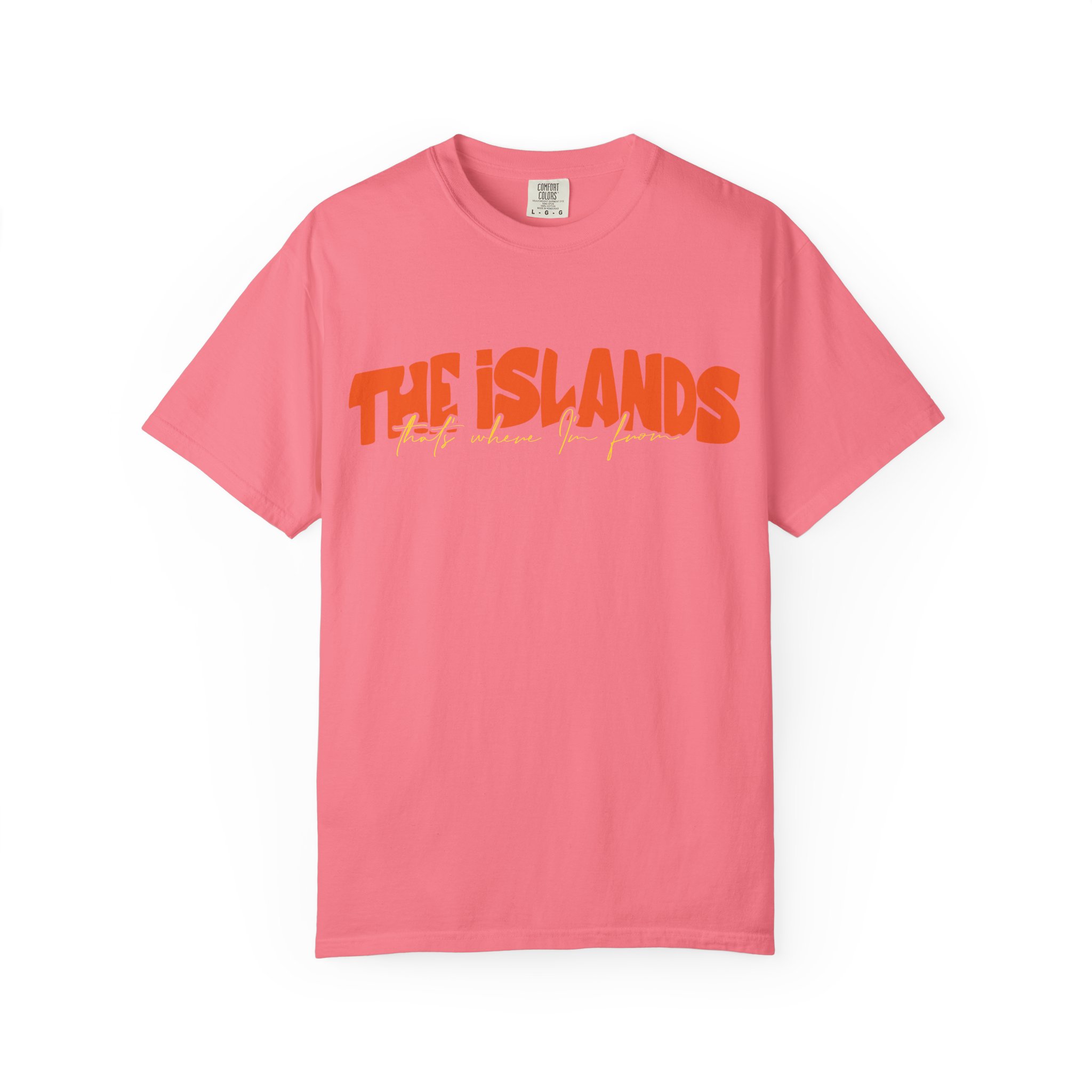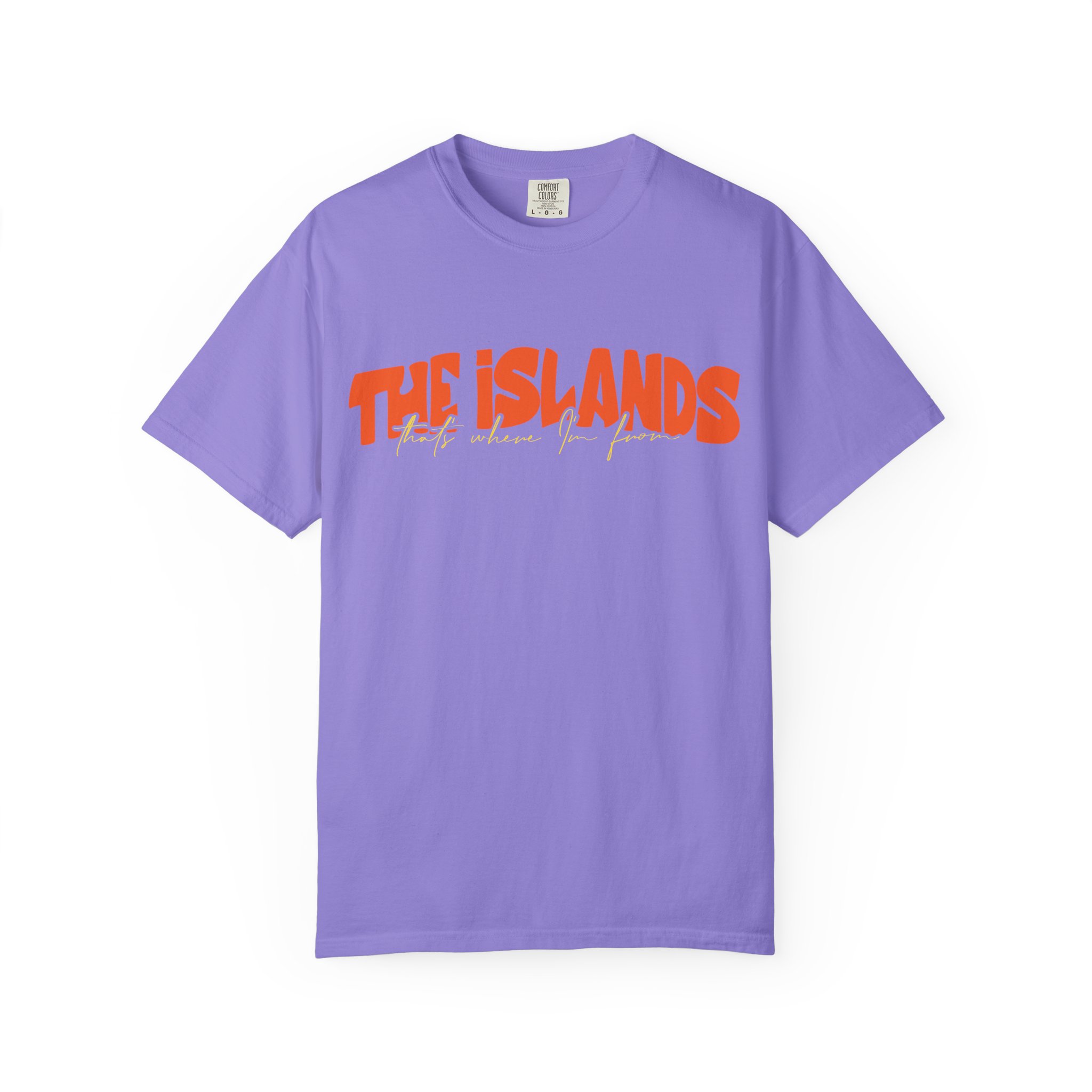 This relaxed-fit garment-dyed tee carries a sun-warmed, island-ready vibe — soft, heavyweight cotton that settles like an old favorite and a bold, hand-lettered “THE ISLANDS” across the chest in sunset-orange. It’s built to last: tubular knit with no side seams for a clean drape, double-needle stitching at the edges, and a sewn-in label so the shirt feels lived-in from day one. Wear it for slow mornings on the porch, salty drives along the coast, or late-night bonfires — the muted olive base and vintage-dyed texture make it easy to layer or stand alone as a statement. Available in a wide size range and many colors, this tee blends comfort and island energy for anyone who wants that laid-back, well-traveled look.